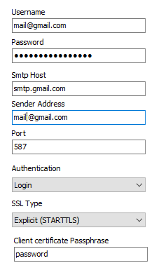 If you use the client certificate delivered with the application leave the Passphrase password on default value ("password").